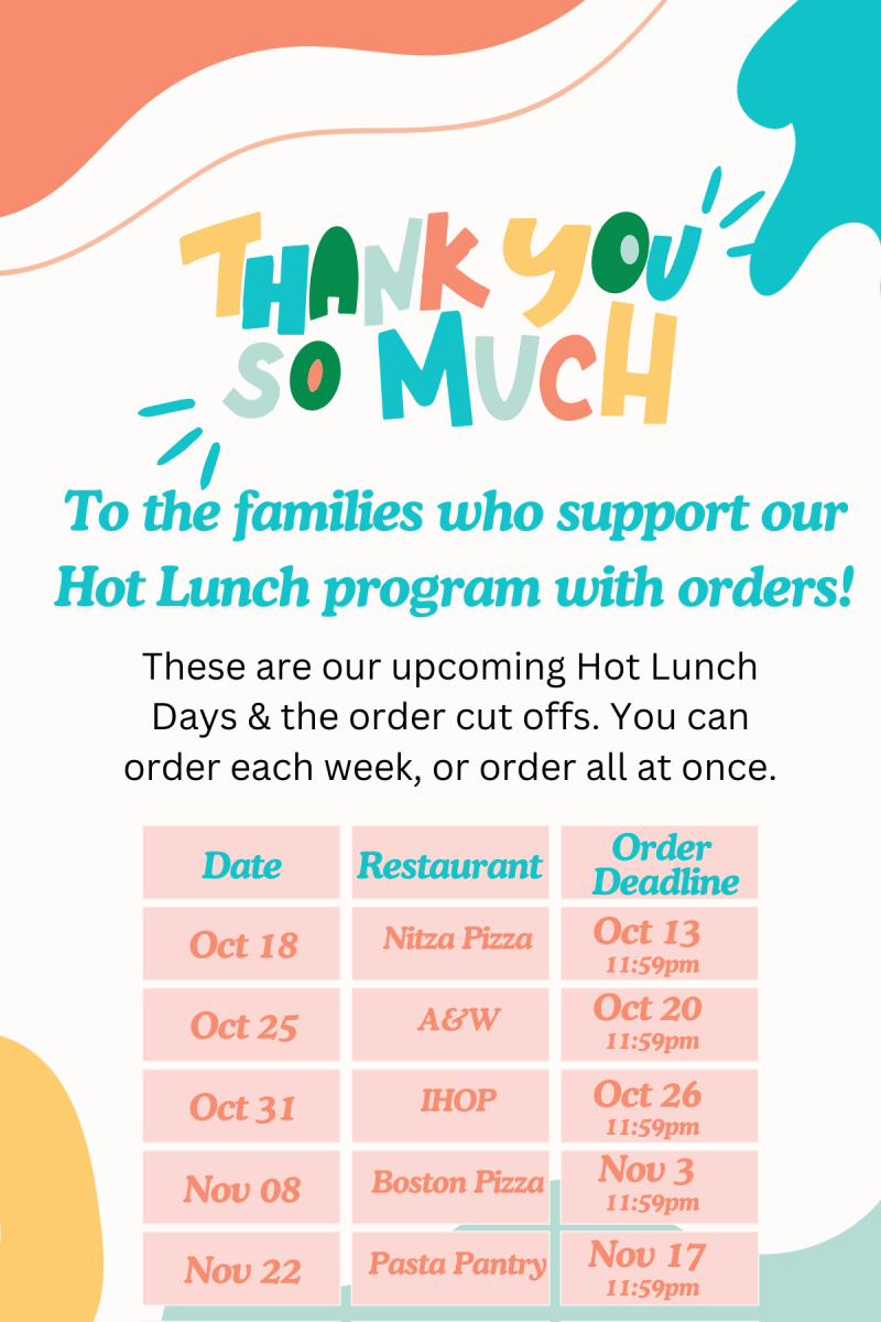Fri. Oct 18th- Hot Lunch Nitza Pizza (order deadline Sun. Oct 13th 11:59pm)