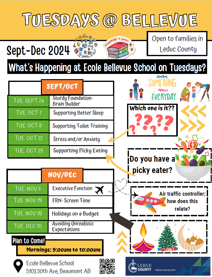 Please join us every Tuesday morning in our staff room (9:00-10:00am). These parent sessions are facilitated by Kathy Krothers (FCSS), BGSD’s Occupational Therapy team, and the Family Resource Network. Everyone is welcome: City of Beaumont and Leduc County residents, and anyone else who could benefit from these sessions. We will have an advert with all of our sessions until the holiday break coming out very soon. This Tuesday’s session is Setting the Foundation and a meet and greet. Coffee and treats provided! Please feel free to tell your neighbors and/or family…..anyone who can benefit!